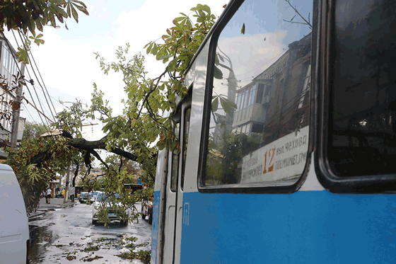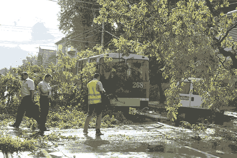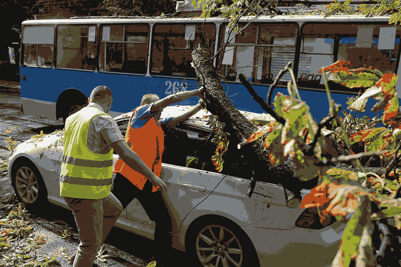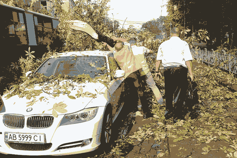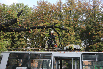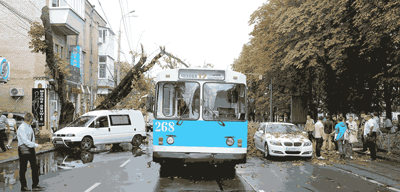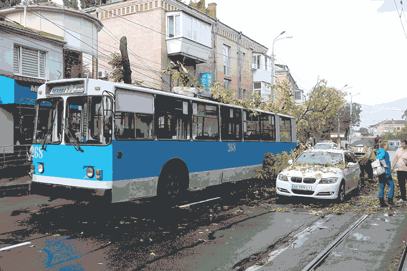Сьогодні під час зливи у Вінниці на вул.Пирогова на тролейбус із людьми упав старий каштан. Лише дивом ніхто не постраждав… Бо дерево зупинилось на фургоні ФІАТ, який взяв на себе весь удар. Інакше 12-й тролейбус і біла БМВ зазнали б більших ушкоджень. Репортаж з місця події Сергія Хіміча.