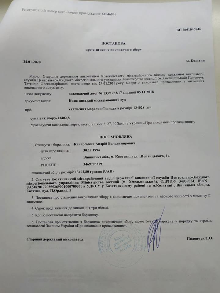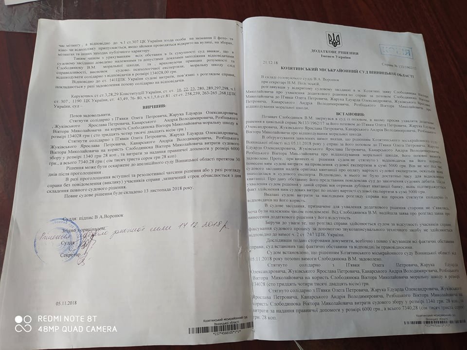 А невдовзі п’ятеро воїнів отримали документи, де голова райради Віктор Слободянюк через суд вимагає виплатити йому аж 300 тисяч гривень моральної компенсації. Довгих два роки тривали судові засідання, один з ветеранів за той час помер внаслідок онкохвороби, то ж його виключили зі справи. А нещодавно стало відомо, що Козятинський міськрайонний суд таки виніс рішення на користь голови райради і постановив, аби воїни АТО виплатити потерпілому 160 тисяч гривень компенсації.