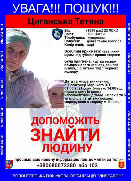 Пішла з дому із двома неповнолітніми дітьми: Циганська Аліна Василівна, 3 роки та Циганська Дар’я 5місяців. Поїхали маршруткою в сторону міста Вінниці.