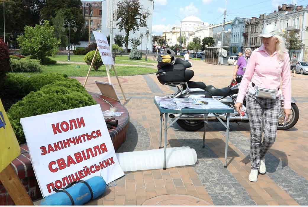 30 липня відомий вінницький байкер Леонід Бобрук розпочав безстрокову акцію протесту. Під стінами мерії він розмістив свій мотоцикл, розклав на підлозі шоломи та встановив транспаранти із написами: «Хто кришує поліцейський кримінал», «Стаття 185: непокора – навіщо калічити та вбивати», «Ми не бидло, ми українці».
