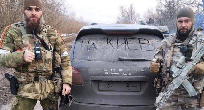 27 лютого у мережу потрапило відео величезної колони “кадирівців”, у підписі до якого зазначалося, що воно зняте у місцевості, що розташована північніше від Києва. Майже тоді ж у соціальних мережах був опублікований ролик, ймовірно, з селища Буча. На записі місцевий житель демонструє знищену колону військової техніки та каже: “Це кадировці”.