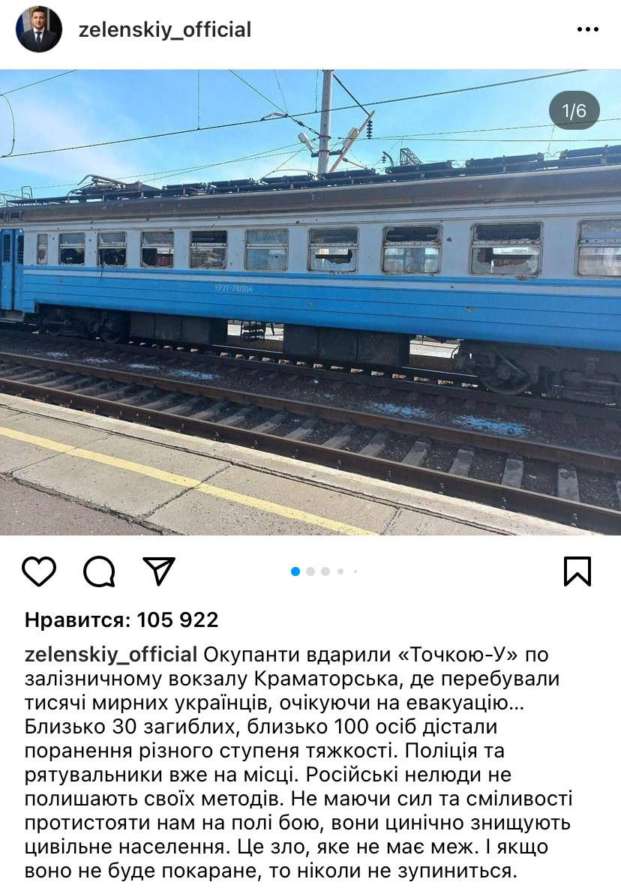 Злочинна пропагандонія рашистів знову годуватиме своїх агресивних орків фейками, що “нацики відомстили за своїх дітей в Бучі і вдарили по русскоговорящих жителях Краматорска”. Цинічний, брехливий руський мір, від якого вже відвернувся майже увесь світ знову сіє смертельні провокації, щоб виправдовувати наступні злочини проти людяності. На вокзалі під час атаки було 4 тисячі людей, переважно жінки, діти та літні і інваліди. Орки про це знали і нікого не пожаліли. Будьте ви прокляті разом зі своїми солдатами-фашистами!