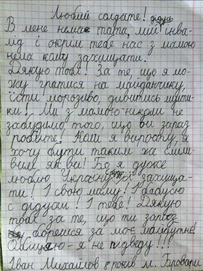 – Ваня написав листа в 2014 році. Зараз вже закінчив школу. Але цей лист актуальний,як ніколи, – уточнила Олена Хоменко