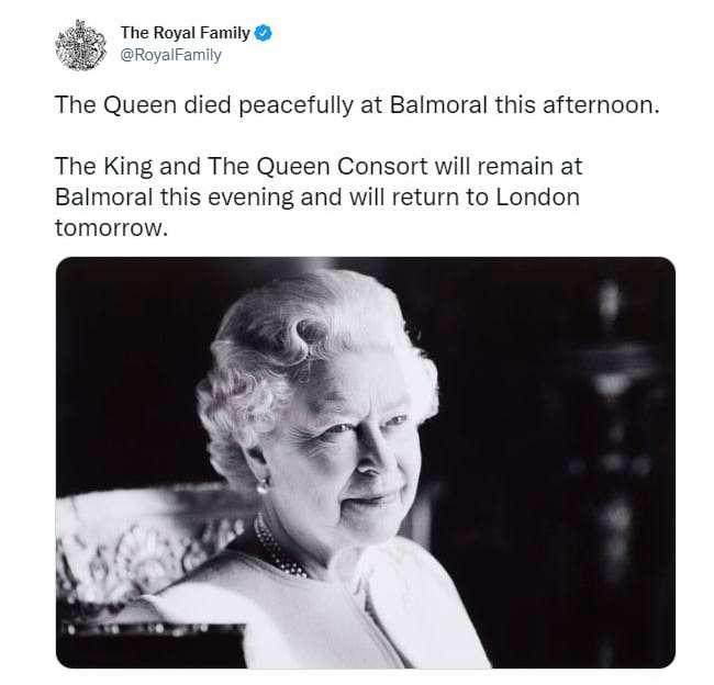 – Королева мирно померла в Балморалі сьогодні вдень”.