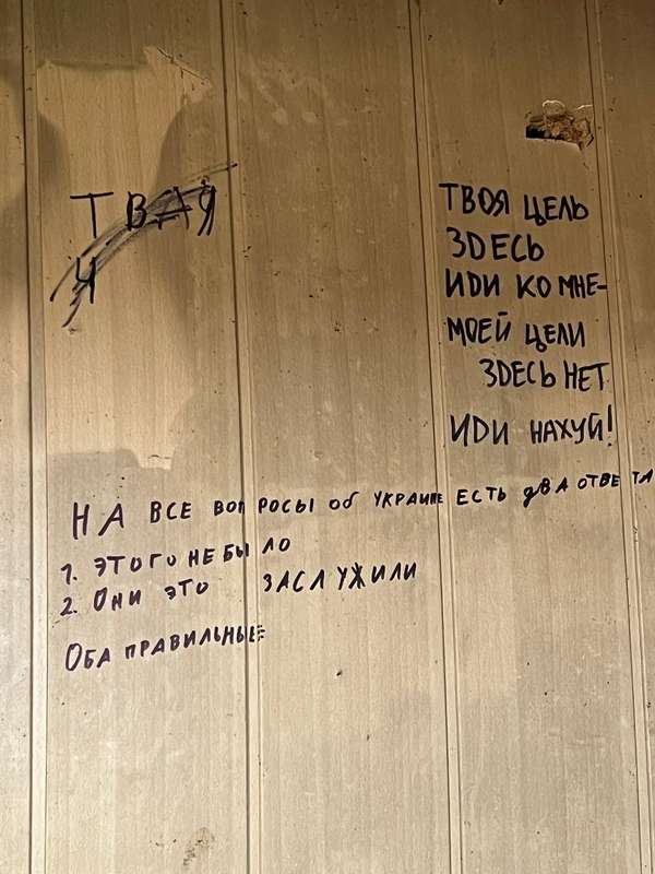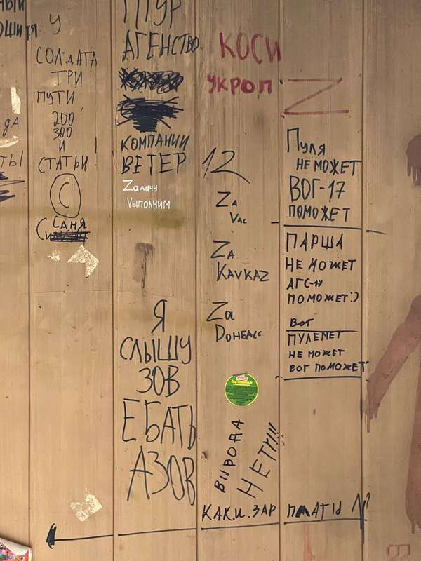 На фото: Велика Комишуваха, Харківщина. Окупанти розписали стіни власними версіями “пацанських цитат”.