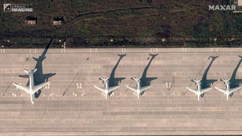 На знімках зафіксовано майже два десятки дальніх бомбардувальників Ту-95 і Ту-160, які готуються до чергової атаки.