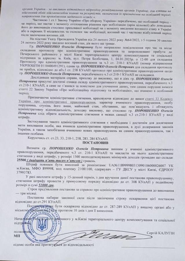 “Визнати гр. Порошенка Олексія Петровича винним у вчинені адміністративного правопорушення, передбаченого 4.3 ст. 210-1 КУпАП та накласти на нього адміністративне стягнення у виді штрафу, у розмірі 1500 неоподатковуваних мінімумів доходів громадян, що складає 25 500 грн”, – йдеться у постанові начальника Печерського ТЦК та СП у м. Києві.
