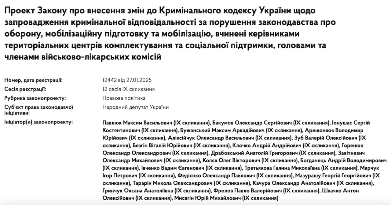 У Верховній Раді України зареєстровано законопроєкт про внесення змін до Кримінального кодексу щодо запровадження кримінальної відповідальності за порушення законодавства про оборону, мобілізаційну підготовку та мобілізацію, вчинені керівниками територіальних центрів комплектування та соціальної підтримки, головами та членами військово-лікарських комісій.