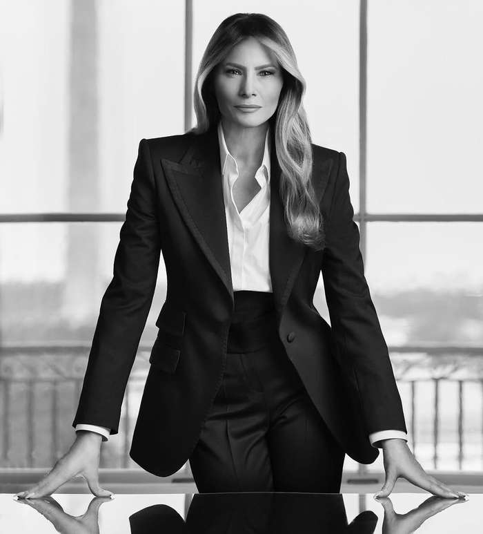 На фото зображена Меланія Трамп у класичному діловому костюмі. Світлина виконана в чорно-білих тонах, фон розмитий, а перша леді стоїть перед великим вікном, поклавши руки на стіл.