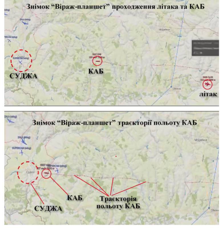 Повітряні сили ЗСУ оприлюднили скриншоти із системи “Віраж-планшет” із траєкторією польоту російської керованої авіаційної бомби по Суджі Курської області РФ.