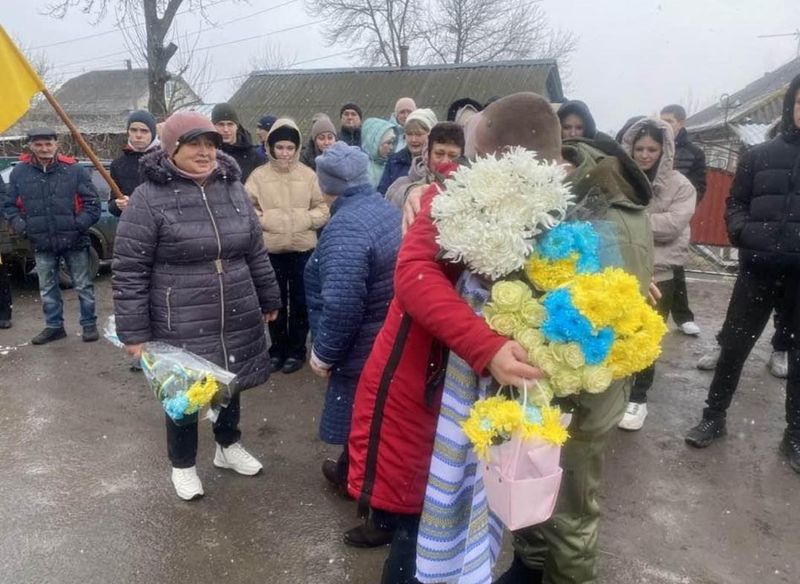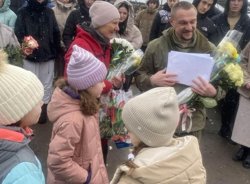 Чоловіка звільнили під час одного з обмінів. Зустріч земляка відбулася біля місцевої школи. Вихованці садочка вручили військовослужбовцю малюнки, квіти та іменний прапором.