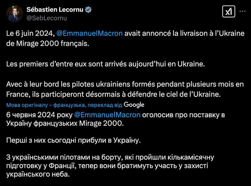 З українськими пілотами на борту, які пройшли кількамісячну підготовку у Франції, тепер вони братимуть участь у захисті українського неба, – повідомив міністр оборони Франції Себастьян Лекорню.