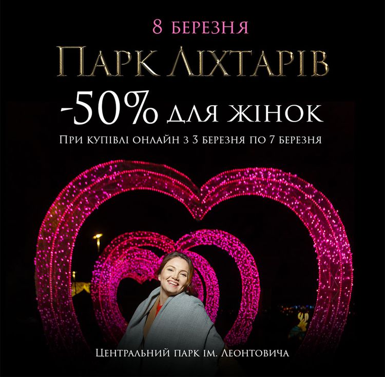 У відкритому нещодавно Вінницькому Парку ліхтарів до 8 березня підготували особливий сюрприз для жінок. Перші відвідувачки отримають весняні квіти при вході, а всі жінки зможуть скористатися знижкою 50% на квитки при їх покупці онлайн з 3 по 7 березня.