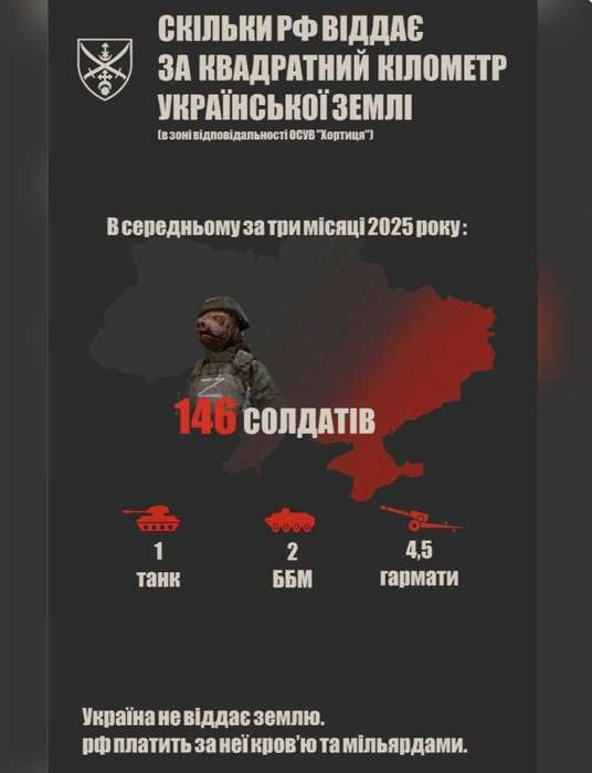 За даними військових оперативно-стратегічного угрупування військ «Хортиця», за три місяці 2025 року в середньому за кожний квадратний кілометр української землі росія витратила 146 солдатів, танк, два ББМ та 4,5 гармати.