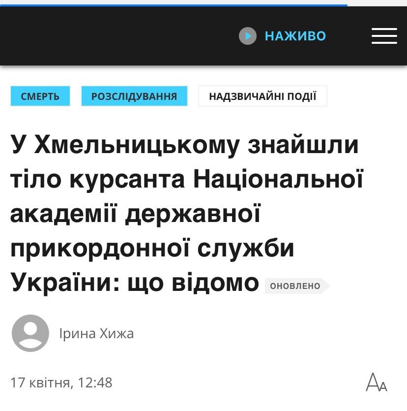 У Хмельницькому знайшли тіло 20-річного курсанта першого курсу Національної академії державної прикордонної служби імені Богдана Хмельницького з ознаками вогнепального поранення.