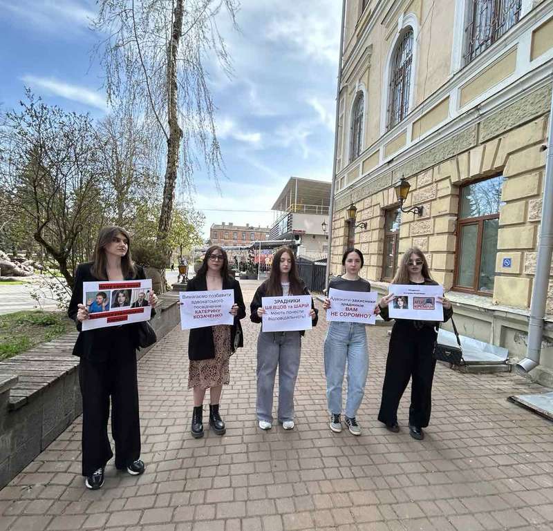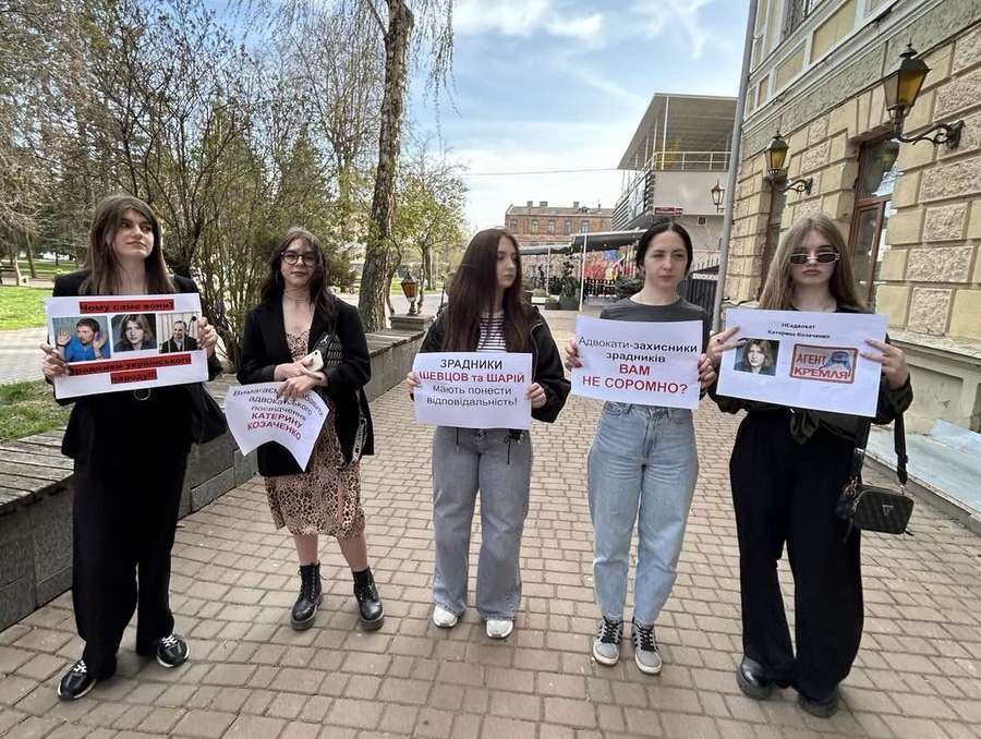 На відео: так проводжають активісти біля суду адвокатку Шарія Катерину Козаченко. Адвокати Шевцова вийшли через чорний хід.