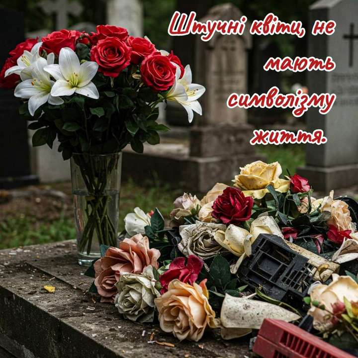 Штучні ж квіти є символом фальші, вони не передають ані тепла людської душі, ані справжньої любові. Вони створені з пластику — матеріалу, який несе шкоду Божому творінню, бо не розкладається в природі. Тим самим, несучи такі квіти, ми не тільки зневажаємо символіку життя і смерті, а й шкодимо землі, яку Бог доручив нам оберігати.