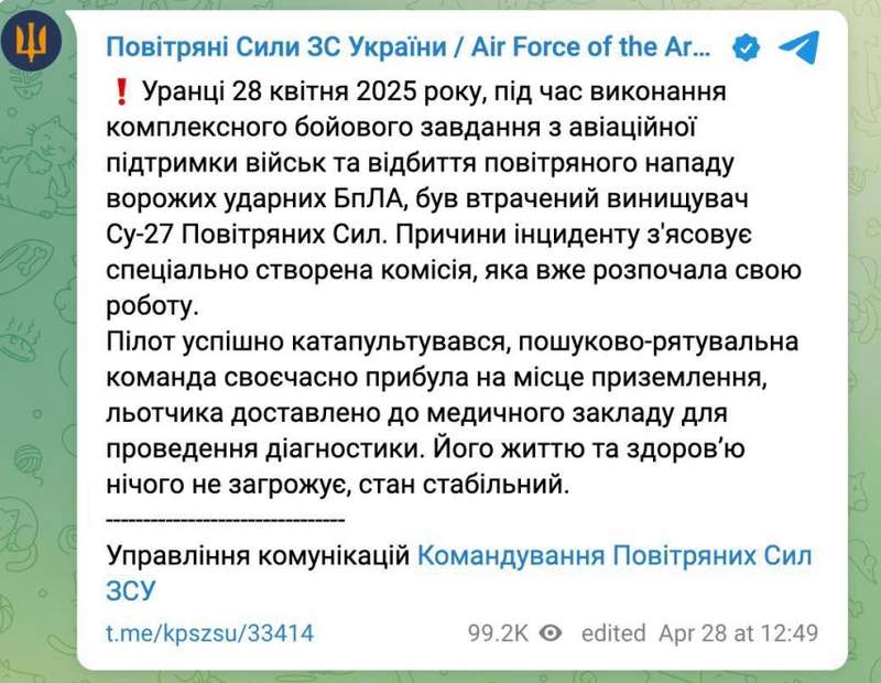 Пілот літака успішно катапультвувався — його життю нічого не загрожує, стан стабільний.