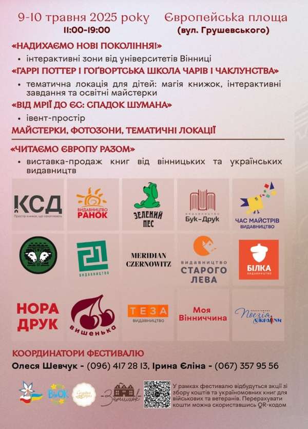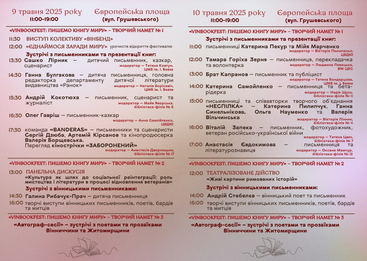 Для дорослих і молоді працюватимуть івент-простір «Від мрії до ЄС: спадок Шумана», зона «Читаємо Європу разом» з книжковими новинками від українських та місцевих видавництв, а також «VinBookFest: пишемо книгу Миру» – творча локація для зустрічей з авторами. До фестивалю долучаться й університети міста, які підготували для гостей інтерактивні зони.