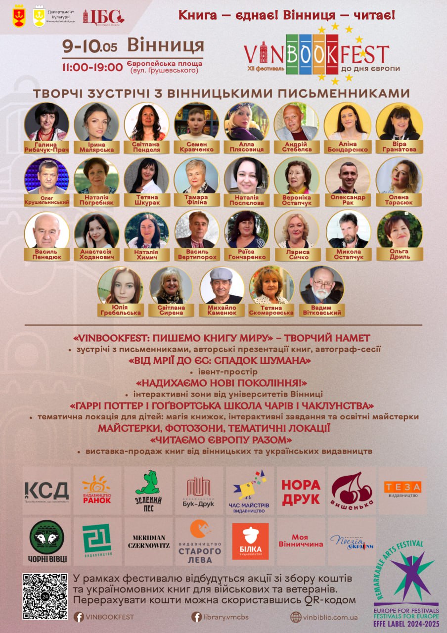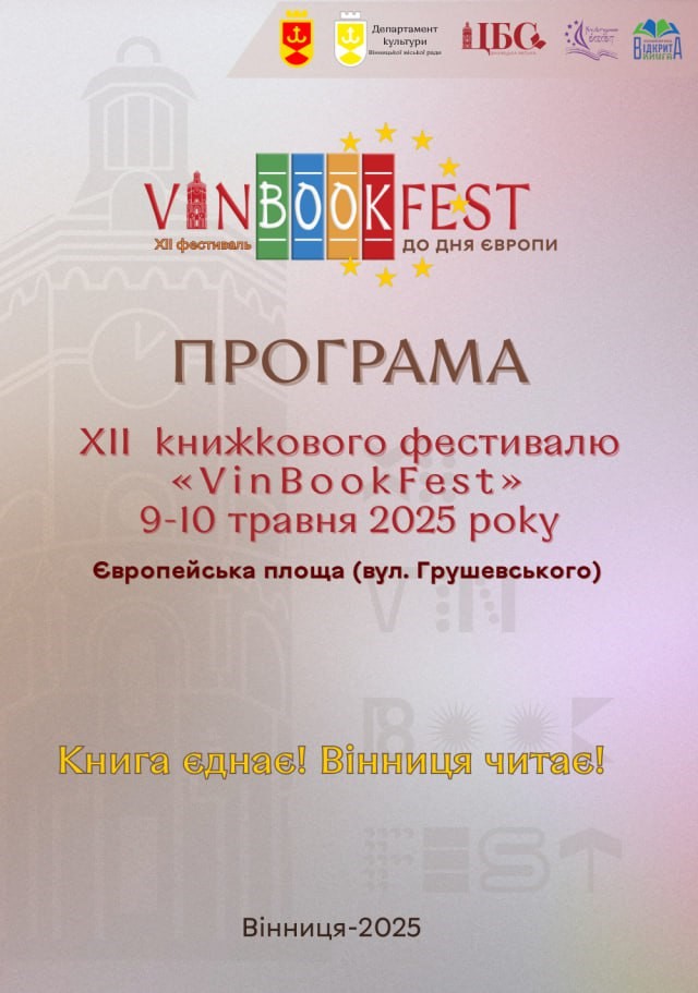 9 та 10 травня Вінниця на два дні перетвориться на справжню книжкову столицю України. У місті пройде вже ХІІ фестиваль «VinBookFest» – подія, що об’єднує письменників, видавців, книгорозповсюджувачів, мистецьких діячів та, звісно ж, читачів та читачок. Цьогоріч подія проходитиме під гаслом «КНИГА – єднає! ВІННИЦЯ – читає!».