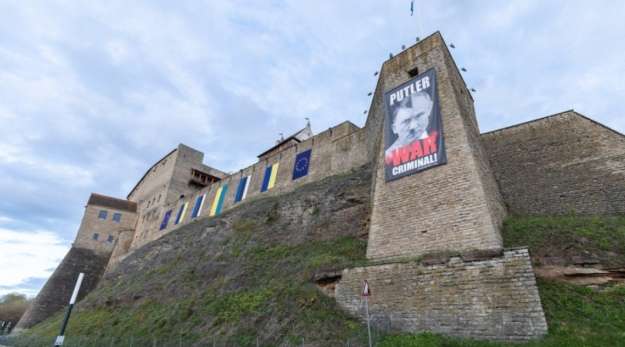Плакат, на якому написано “Путлер – воєнний злочинець”, вивішений на стіні Нарвського замку, яка звернена в бік Росії.