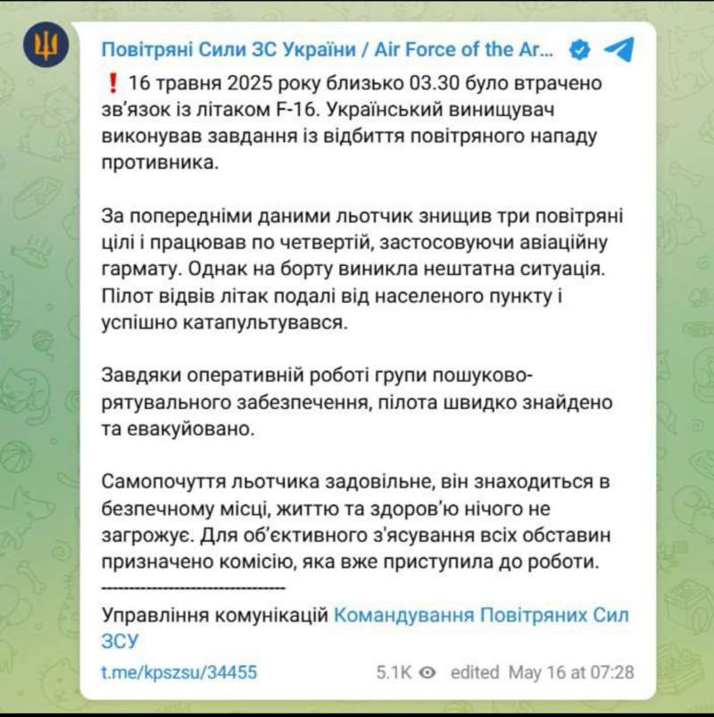 Повітряні сили ЗСУ в Facebook: Близько 03:30 16 травня зв’язок із літаком F-16 зник. У цей час український винищувач виконував завдання із відбиття повітряного нападу противника.