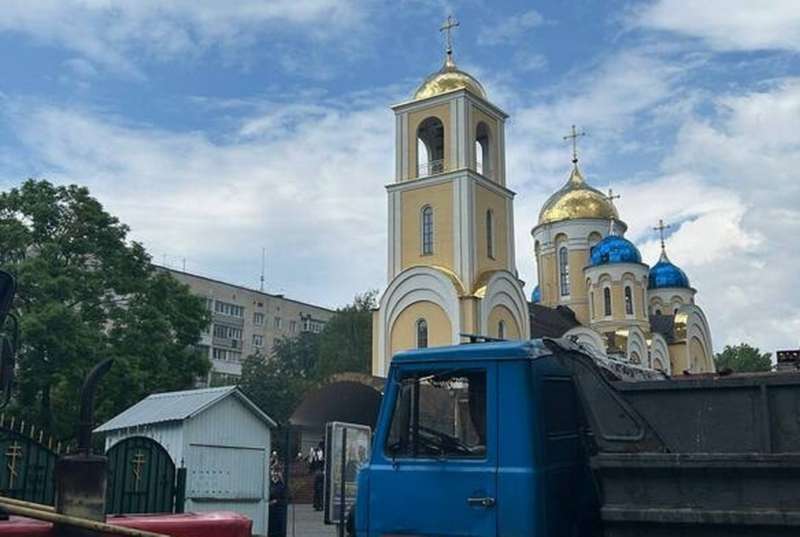 Біля храму також були правоохоронці. Вхід на територію храму зачинений, людей туди впускають вибірково. Довкола церковного паркану – важка техніка – трактори та вантажівки.