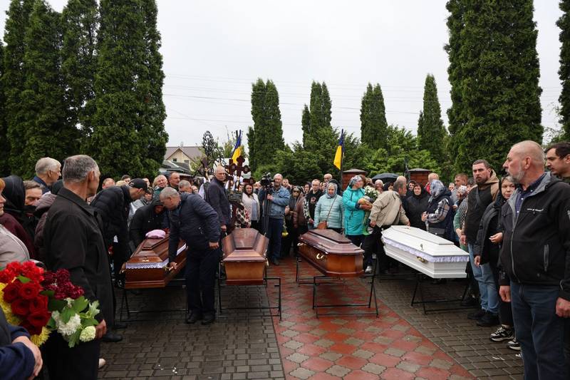 До красилівської Воскресенської церкви попрощатися з чотирма цивільними місцевими жителями, які загинули 25 травня унаслідок російського удару, прийшло пів тисячі людей.