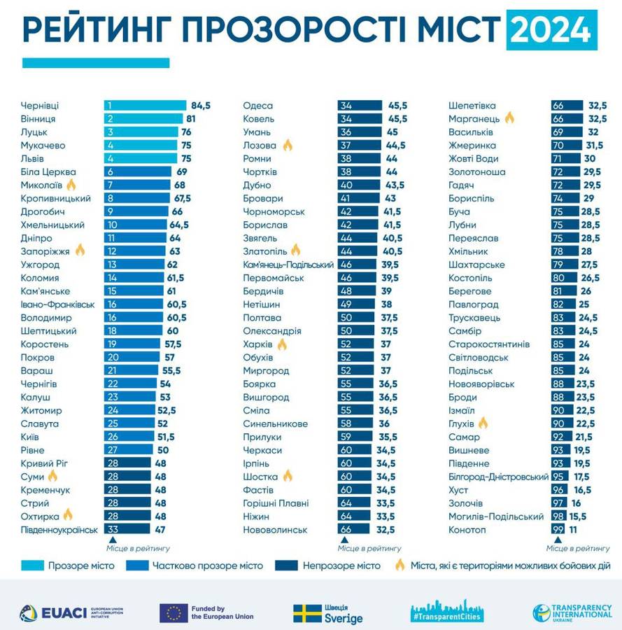 Програма «Прозорі міста» Transparency International Ukraine презентувала результати річного Рейтингу прозорості українських міст. За підсумками дослідження Вінниця потрапила до трійки лідерів. За показником «Найкращі практики управління» наша громада випередила всі міста. А в загальному підсумку – посіла другу позицію, отримавши 81 бал. Чернівці набрали 84,5 бала та очолили рейтинг, а замикає трійку найпрозоріших – Луцьк із 76 балами.