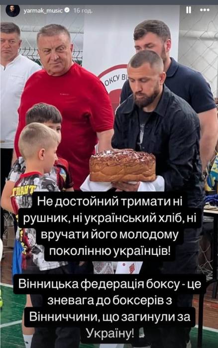 “Недостойний тримати ні рушник, ні український хліб, ні вручати його молодому поколінню українців. Вінницька федерація боксу – це зневага до боксерів з Вінниччини, що загинули за Україну”, – написав артист