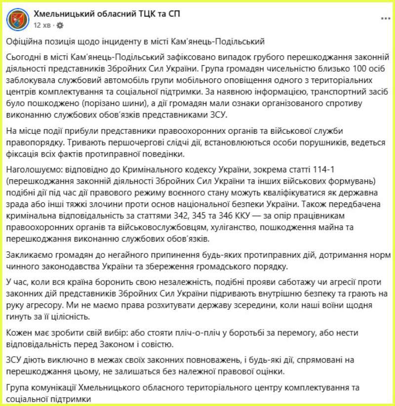 Подія сталася ввечері 29 травня у місті Кам’янець-Подільський. За інформацією ТЦК, близько 100 людей заблокували службовий автомобіль групи мобільного оповіщення одного з територіальних центрів комплектування та соціальної підтримки. “За наявною інформацією, транспортний засіб було пошкоджено (порізано шини), а дії громадян мали ознаки організованого спротиву виконанню службових обов’язків представниками ЗСУ”, – йдеться у повідомленні.