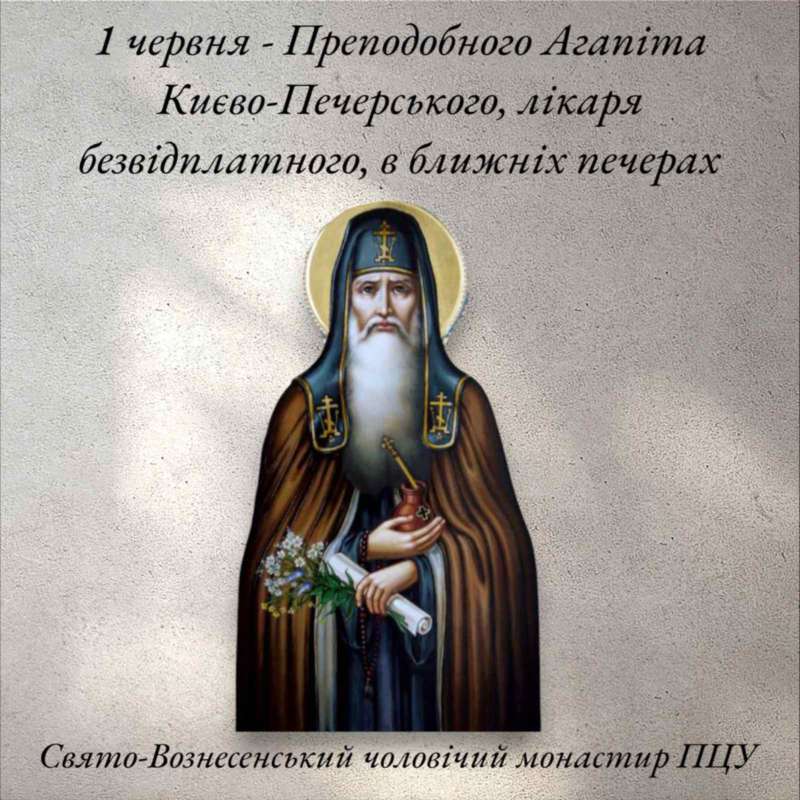 Преподобний Агапіт Печерський народився у Києві, був учнем преподобного Антонія Печерського. Преподобний безоплатно допомагав хворим, зцілюючи їх своєю молитвою і даючи їм ті трави, які сам збирав. Зазнав багато скорбот від заздрісного лікаря вірмена, який хотів його отруїти. Але Господь зберіг свого угодника, і отрута не зашкодила йому. Преподобний Агапіт навернув до православ’я свого кривдника, і той став монахом. Після багатьох трудів та подвигів преподобний Агапіт мирно спочив близько 1095 року.
