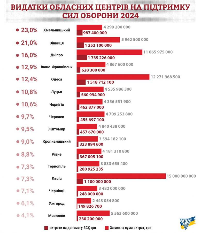 До слова, з бюджету Івано-Франківська та Одеси на підтримку обороноздатності витрачено 12% всіх коштів (628 млн. та 1,5 млрд. відповідно), Луцька і Чернігова – 10% (560 млн та 462 млн), Черкас, Житомира, Кропивницького і Рівного – близько 9% (455 млн, 457 млн, 323 млн, 367 млн).