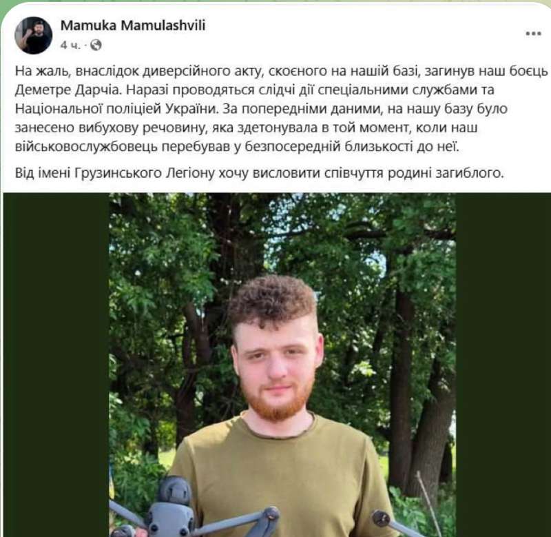 За попередніми даними, на територію бази було занесено вибухову речовину, яка здетонувала поряд з військовим. Пресслужба Грузинського легіону зазначає, що це була добре спланована акція, що підозріло збіглася з 12 червня – так званим днем росії.