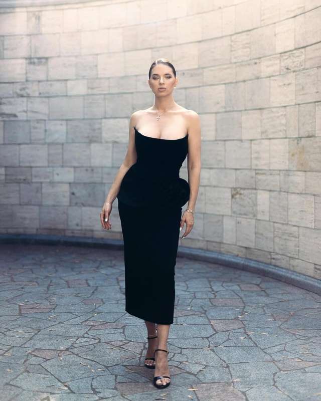 Багатодітна мама підкреслила свою талією та груди ефектним чорним платтям.