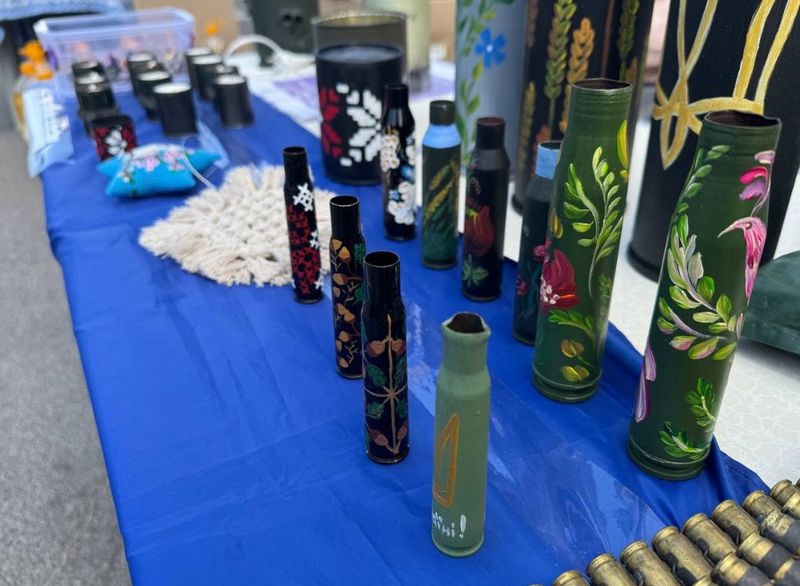 Окрім продавців, на заході були присутні волонтери, які продавали розфарбовані відомими вінницькими школярками – художницями Дарією та Марією тубуси та гільзи.
