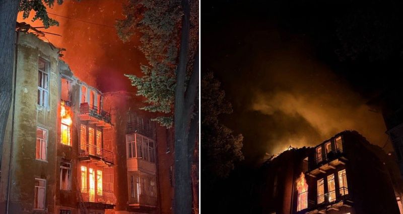 Серед них — троє рятувальників, які постраждали під час ліквідації пожежі в чотириповерховому будинку. Після влучання БпЛА споруда фактично згоріла вщент, обвалилися перекриття.