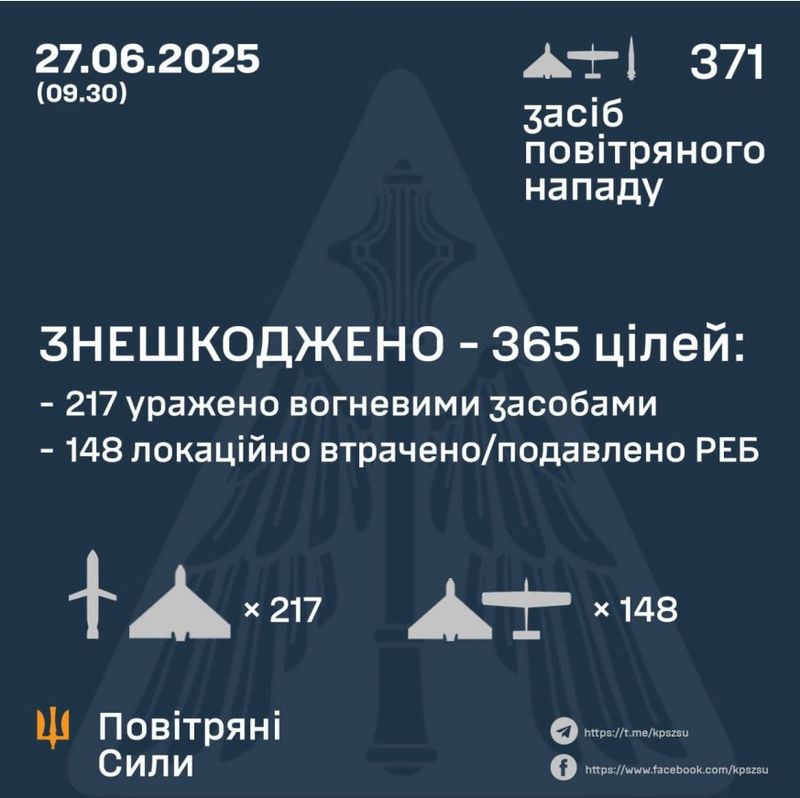 Від вечора 26 червня російські окупанти атакували Україну 363-ма ударними БпЛА типу Shahed і безпілотниками-імітаторами різних типів, 2 аеробалістичними ракетами Х-47 М2 “Кинджал” та 6 крилатими ракетами “Калібр”; 365 повітряних цілей вдалося знищити.