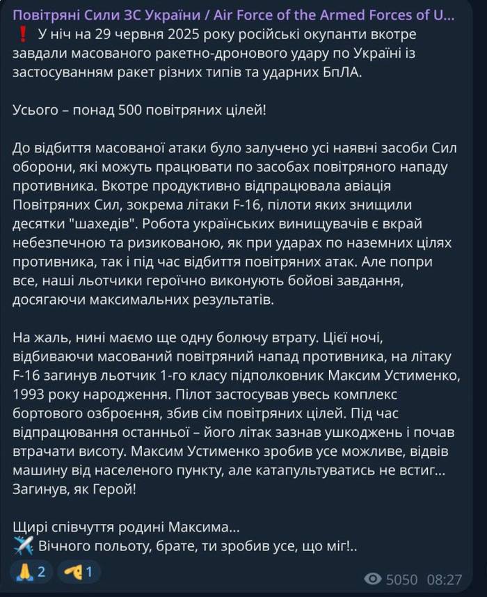 Вночі, відбиваючи атаку противника на літаку F-16, загинув льотчик 1-го класу підполковник Максим Устименко, 1993 року народження, – ПС