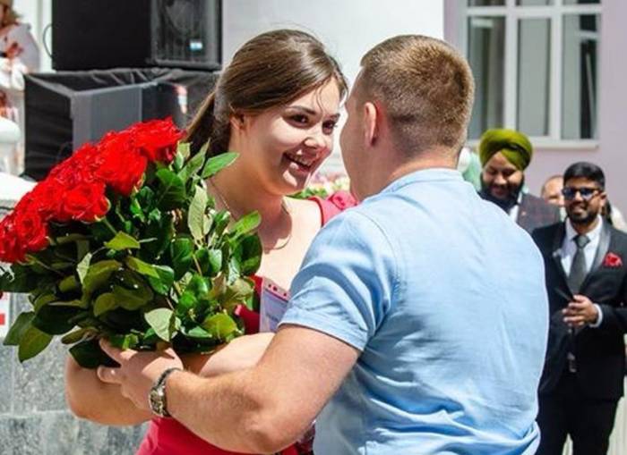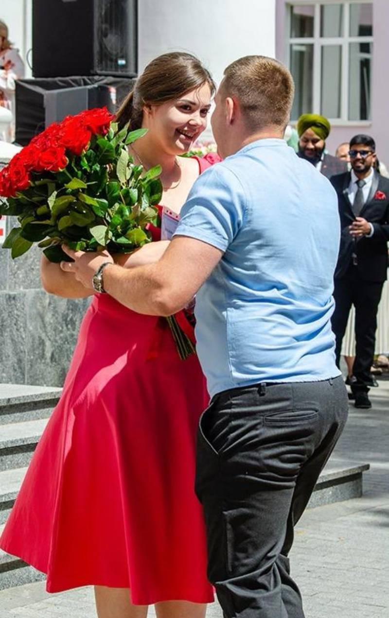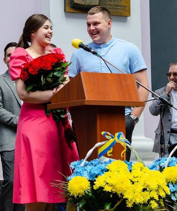Щойно шестикурсниця стоматологічного факультету Тамара Денисюк отримала диплом, коханий, який служить в Національній поліції, освідчився їй — просто на червоній доріжці перед головним корпусом університету.