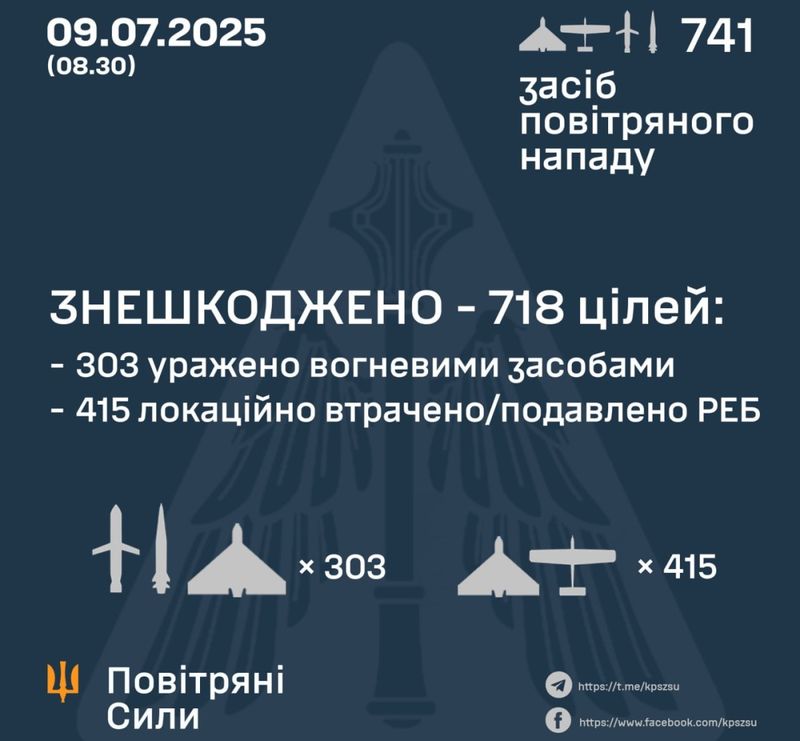 У ніч на 9 липня Росія атакувала 741 засобом повітряного нападу, 718 із них знешкодила ППО, Повітряні сили зафіксували влучання у 4 локаціях, а також падіння збитих – на 14 локаціях.