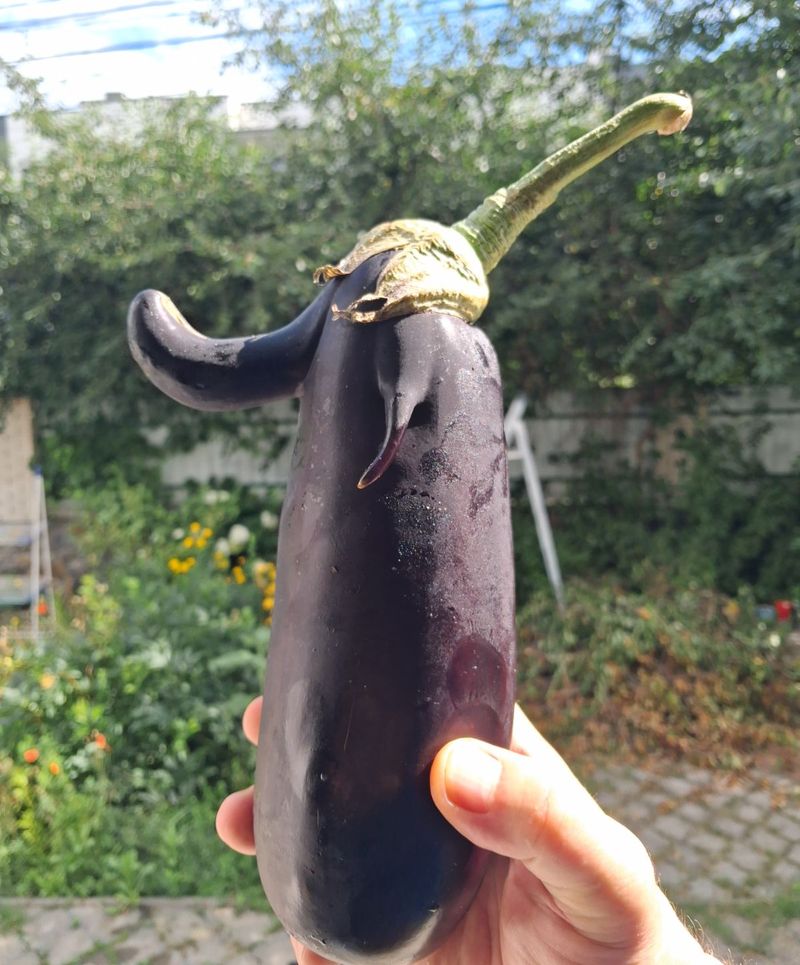 Але тут втручається вона. І мимохіть змушує посміхнутися, глянувши на її черговий викрутас. На цей раз природа жартувала на городі і вийшло ось таке родинне тріо баклажанів-довгоносиків.