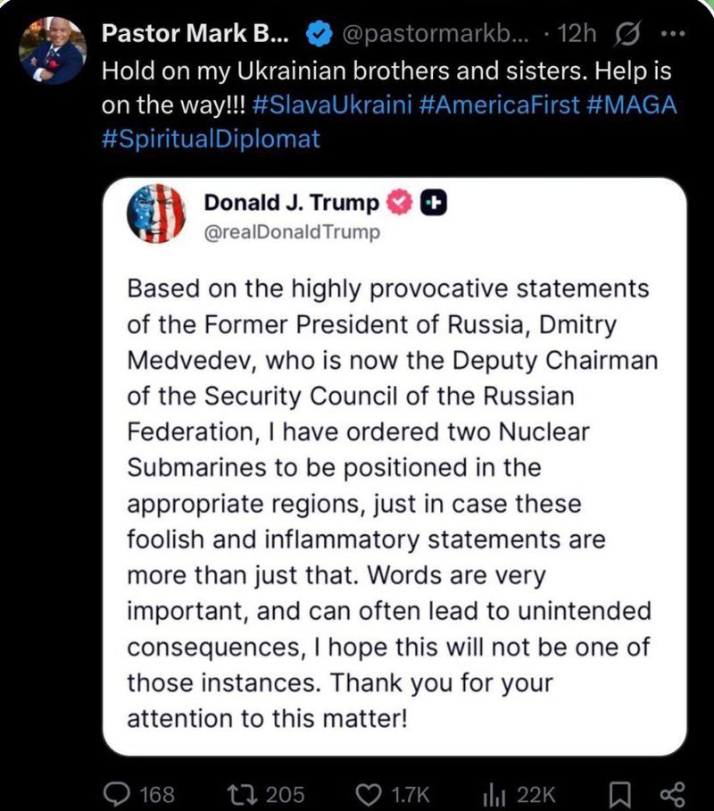 Додавши до допису публікацію самого Трампа про відправлення атомних підводних човнів.