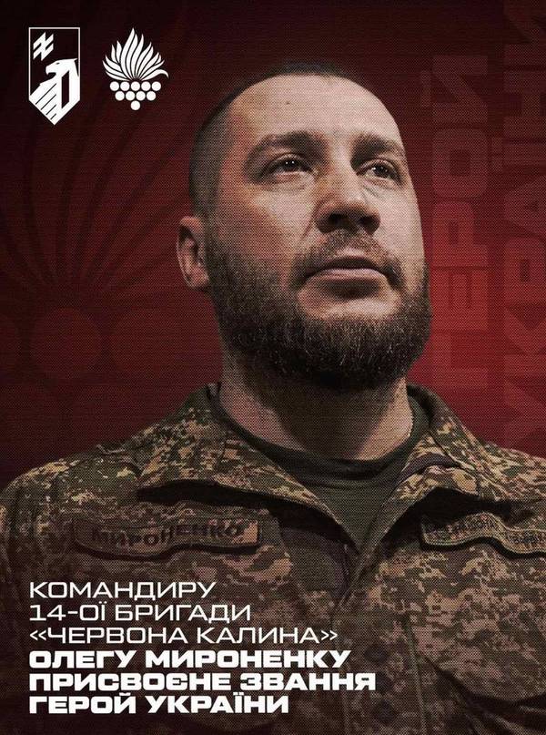 1 серпня президент України Володимир Зеленський присвоїв звання Героя України з врученням ордена «Золота Зірка» командиру 14-ої бригади оперативного призначення «Червона Калина» полковнику Олегу Мироненку. Бригада сформована на базі військової частини на Вінниччині.