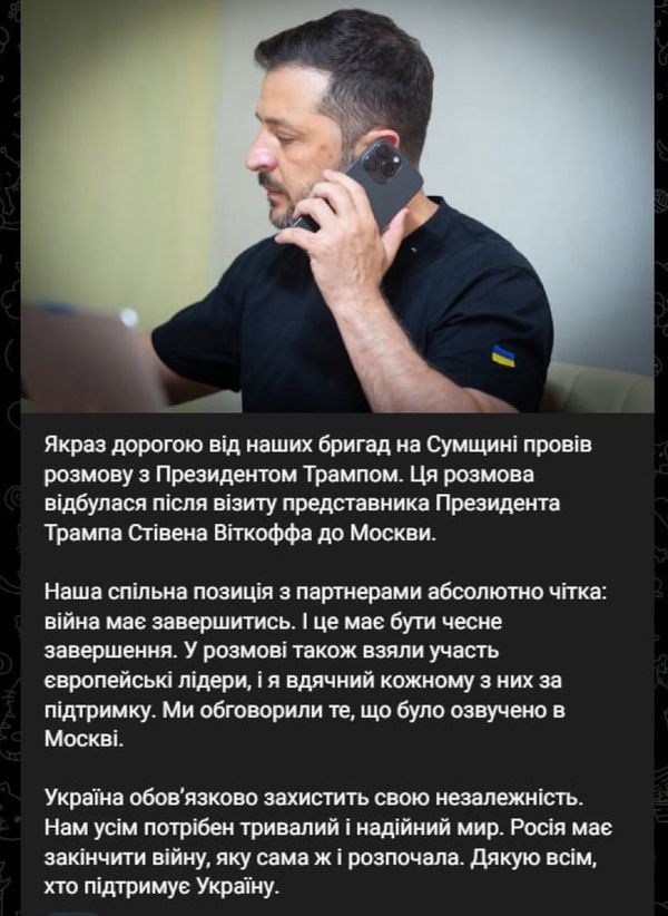 «Наша спільна позиція з партнерами абсолютно чітка: війна має завершитись. І це має бути чесне завершення. У розмові також взяли участь європейські лідери, і я вдячний кожному з них за підтримку. Ми обговорили те, що було озвучено в Москві.