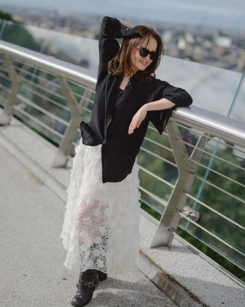 Для фотосесії зірка обрала образи в стилі бохо. Зокрема, Ротару вигуляла спідницю від своєї подруги та хрещеної її онуки – Лілії Пустовіт. А також на іменинниці були трендові масивні чоботи.
