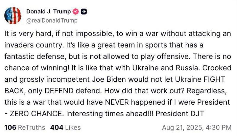 «Дуже важко, якщо не неможливо, виграти війну, не завдаючи ударів по країні-агресору. Це як велика спортивна команда з фантастичним захистом, якій не дозволяють грати в атаку. Шансів на перемогу немає! Так само і з Україною та Росією. Корумпований і вкрай некомпетентний Джо Байден не дозволив Україні БОРОТИСЯ, а лише ЗАХИЩАТИСЯ, захищатися. Як це спрацювало? У будь-якому випадку, цієї війни НІКОЛИ б не було, якби я був Президентом — ЖОДНОГО ШАНСУ. Попереду цікаві часи!!!»
