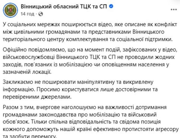 “У соціальних мережах поширюється відео, яке описане як конфлікт між цивільними громадянами та представниками Вінницького територіального центру комплектування та соціальної підтримки.