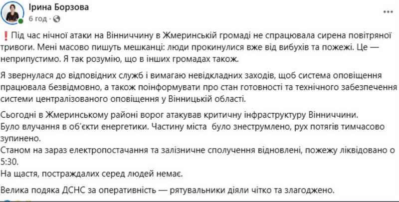 “Під час нічної атаки на Вінниччину в Жмеринській громаді не спрацювала сирена повітряної тривоги. Мені масово пишуть мешканці: люди прокинулися вже від вибухів та пожежі. Це — неприпустимо. Я так розумію, що в інших громадах також. Я звернулася до відповідних служб і вимагаю невідкладних заходів, щоб система оповіщення працювала безвідмовно, а також поінформувати про стан готовності та технічного забезпечення системи централізованого оповіщення у Вінницькій області”, – зазначила народна обраниця.