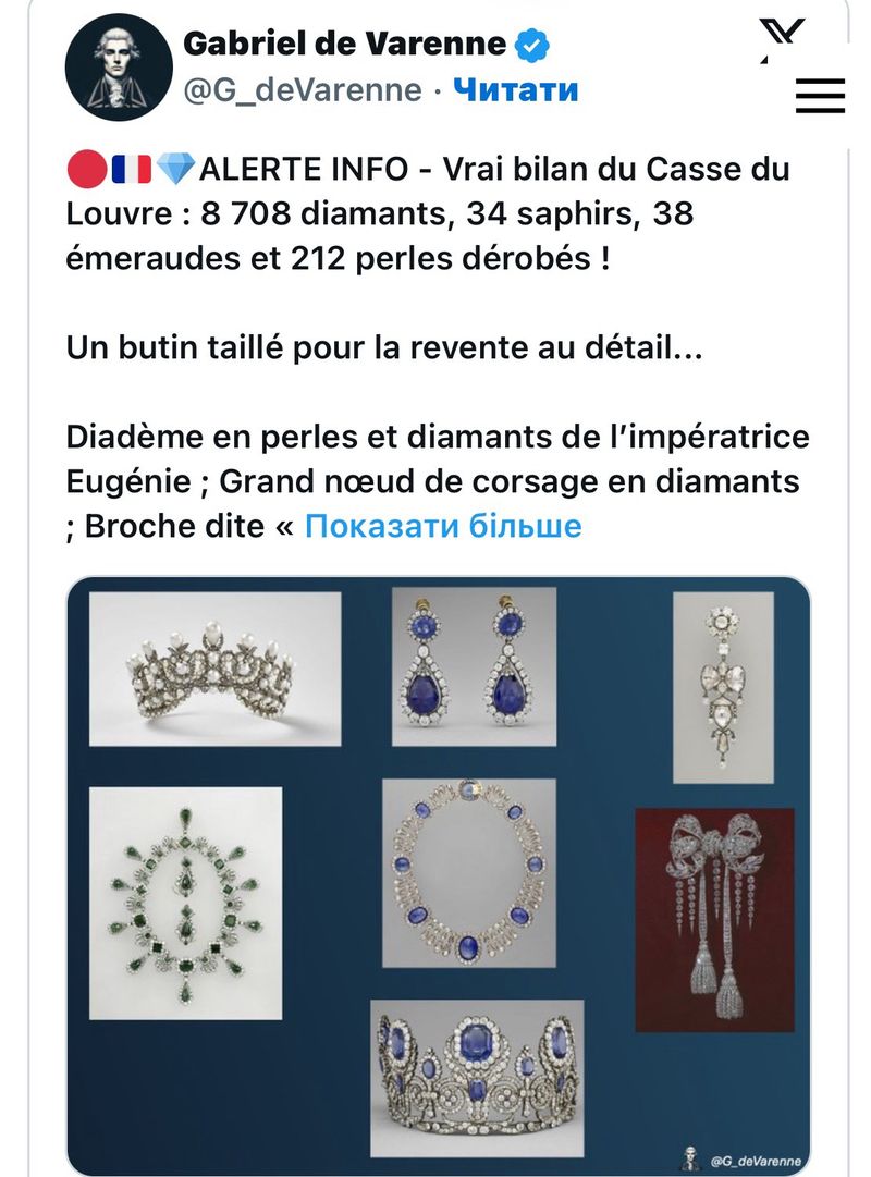 Як відомо, міністерство культури Франції оприлюднило повний перелік королівських коштовностей, викрадених із Лувру під час зухвалого пограбування 19 жовтня. Музей, що закрився після інциденту на невизначений час, опублікував документ у соцмережах.